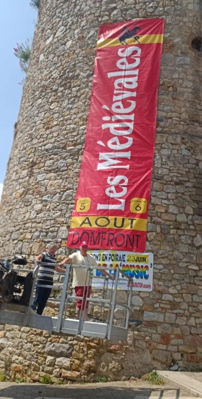 La banderole annonçant les Médiévales est installée au carrefour central sur la tour d’Alençon. © Ouest-France