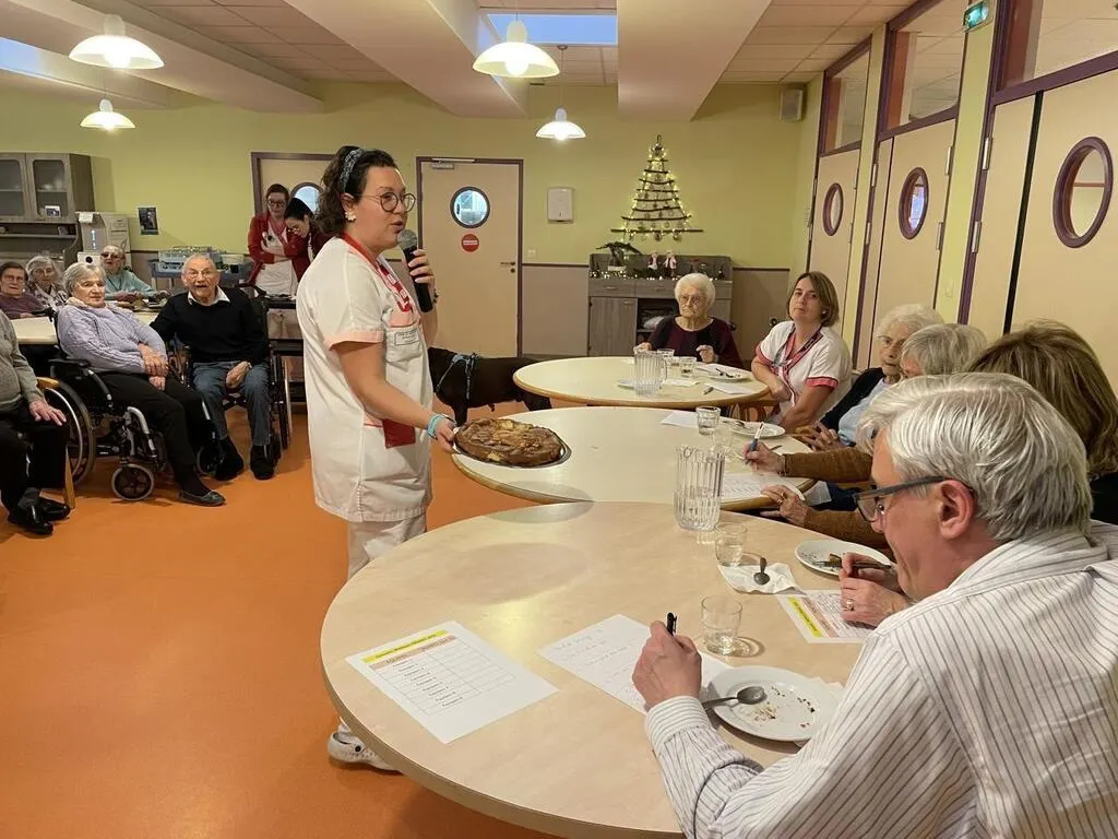 Une grande partie des résidents de l’Ehpad des Hauts Vents de Flers, dans l’Orne, était réunie dans la grande salle, ce jeudi 5 décembre 2024. Ils étaient autant impatients de déguster les gâteaux concoctés par leurs voisins que de savoir quelle serait l’équipe remporterait le prix du meilleur gâteau. Pour la quatrième fois, l’animatrice Mélina Bordel, organisait un concours de pâtisserie. Neuf équipes composées de deux résidents et un salarié et des stagiaires ont cuisiné des gâteaux le matin pendant 1 heure 30, sur le thème des cakes de Noël.