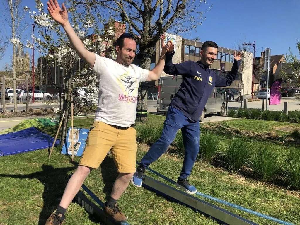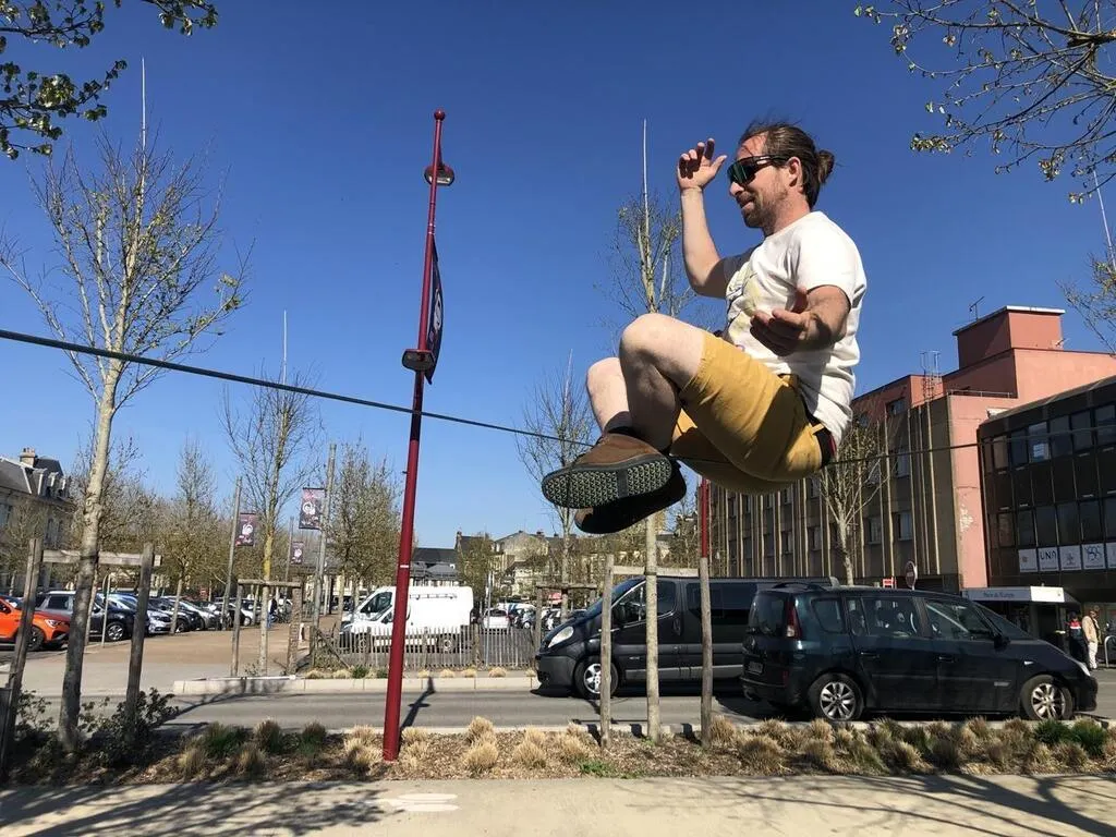 Romain Billard, expert de slackline, proposait des initiations à cette discipline. © Ouest-France