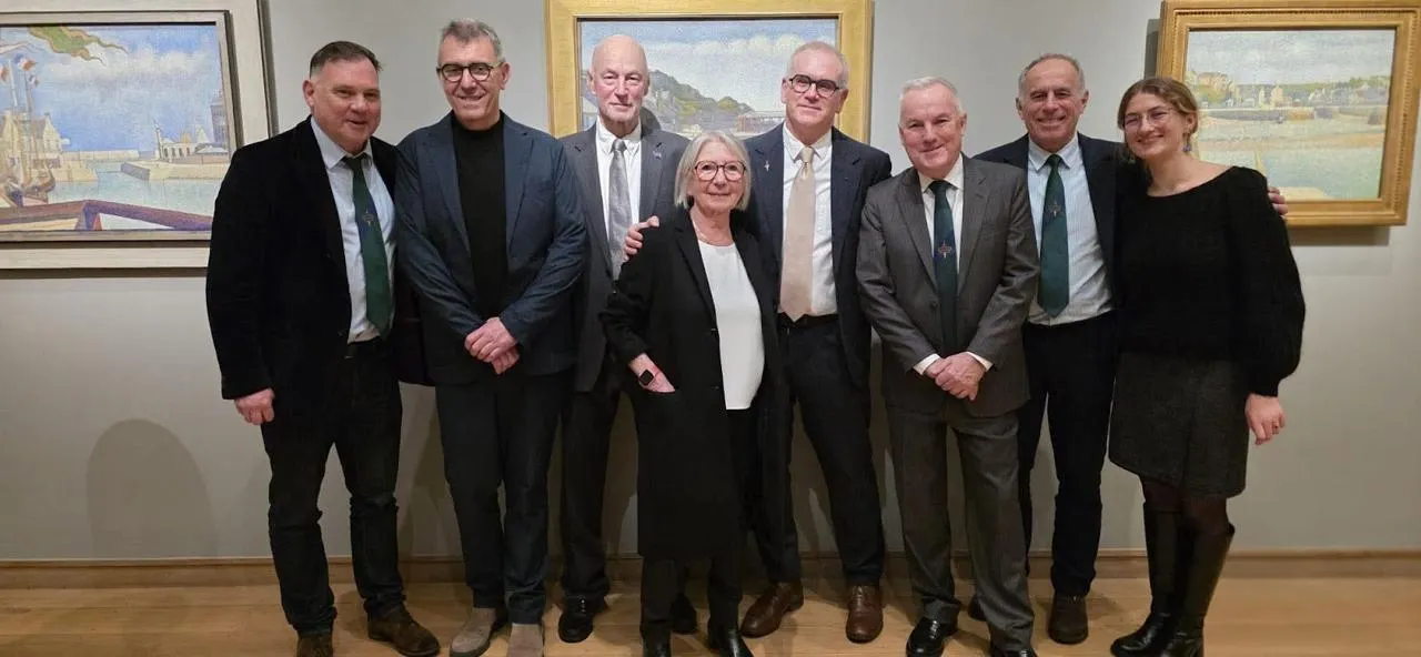 Des personnalités et des représentants de Port-en-Bessin-Huppain (Calvados) lors du vernissage de l’exposition « Seurat et la mer », à Londres (Grande-Bretagne). De gauche à droite : Paddy O’Connell, Thierry Léonnec, Dave Shorrock, Any Allard, Christophe Van Roye, Allen Withington, Bob Perry et Mathilde Allard pour la traduction. © Courtauld gallery