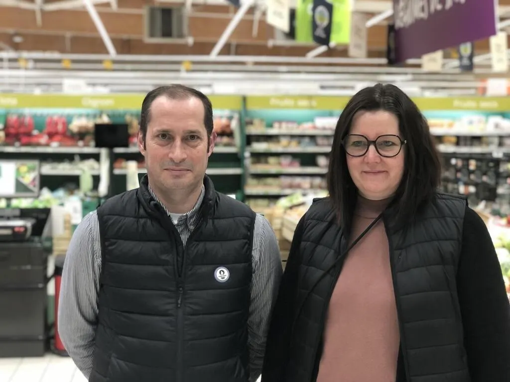 Cyrille Blin, 48 ans et Stéphanie Blin, 46 ans, sont les nouveaux patrons du Carrefour Market de Saint-Georges-des-Groseillers (Orne). © Ouest-France