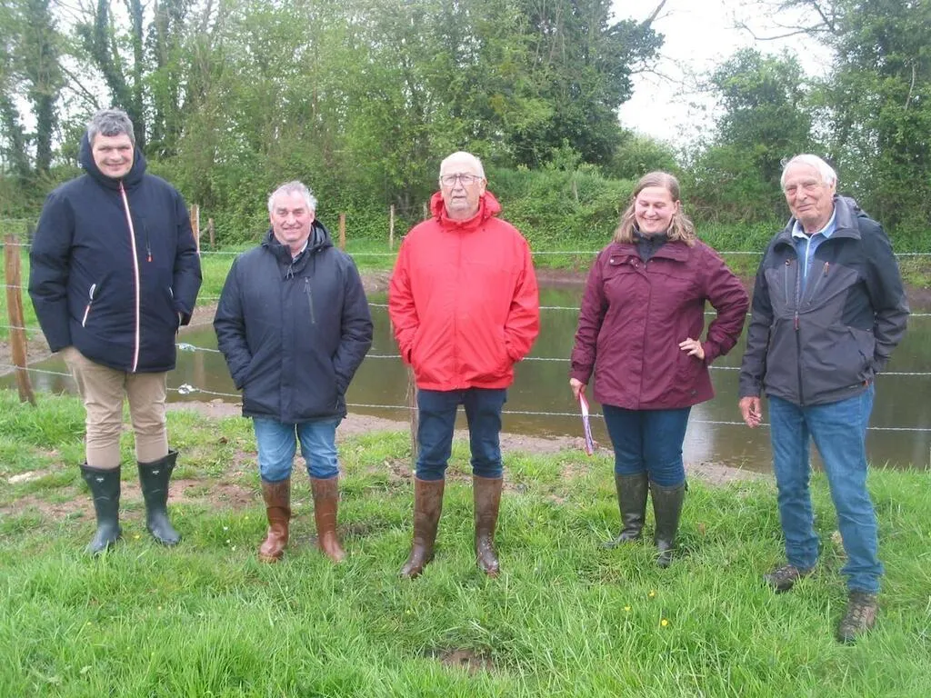 Sébastien Gourdel, président de la Communauté de communes des Vallées d’Auge et du Merlerault ; Christophe Bignon, 2e vice-président du syndicat mixte du bassin-versant de la Touques ; Gérard Rosé, maire de Sap-en-Auge ; Sandie Albiach, technicienne de bassin-versant et Guy Willot, maire adjoint de Sap-en-Auge. © Ouest-France