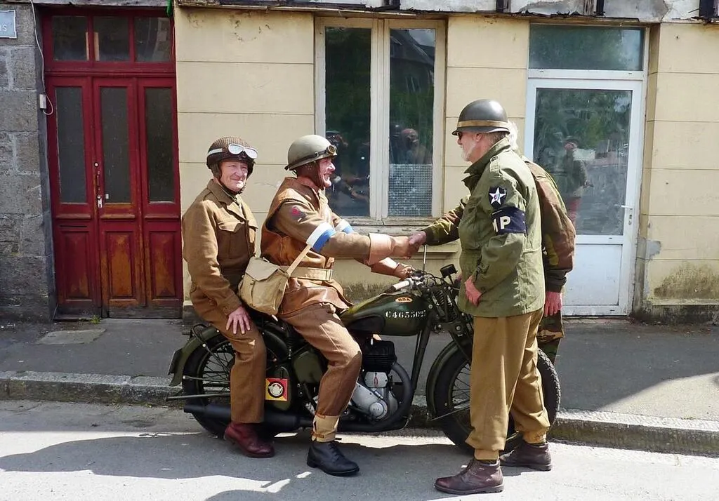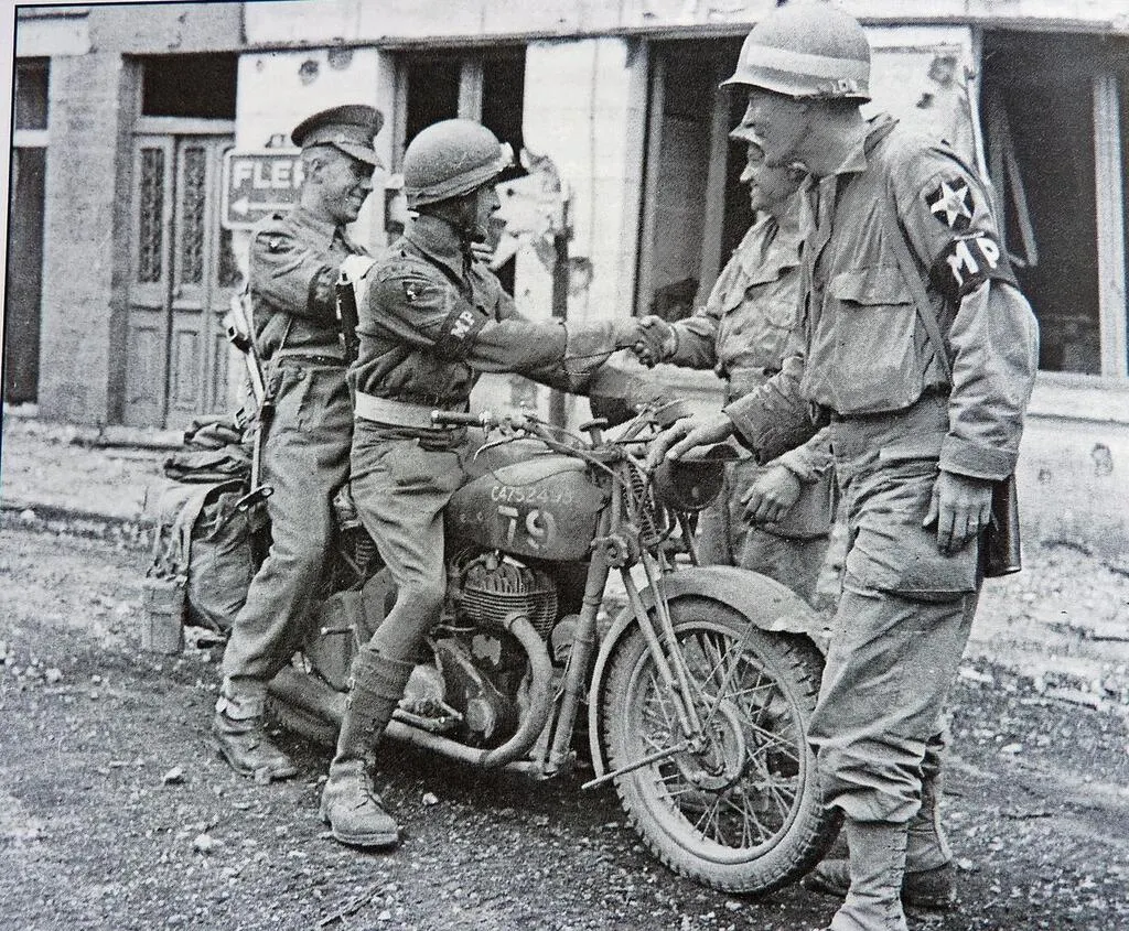 Il est à noter que le poste de commandement de la MP britannique était situé juste en face de l’endroit où a été prise la photo, à l’hôtel de la Pie.  Sur la photo, c’est une moto de marque BSA M20, identique à celle photographiée au n° 2 rue de Paris, en 1944.Â