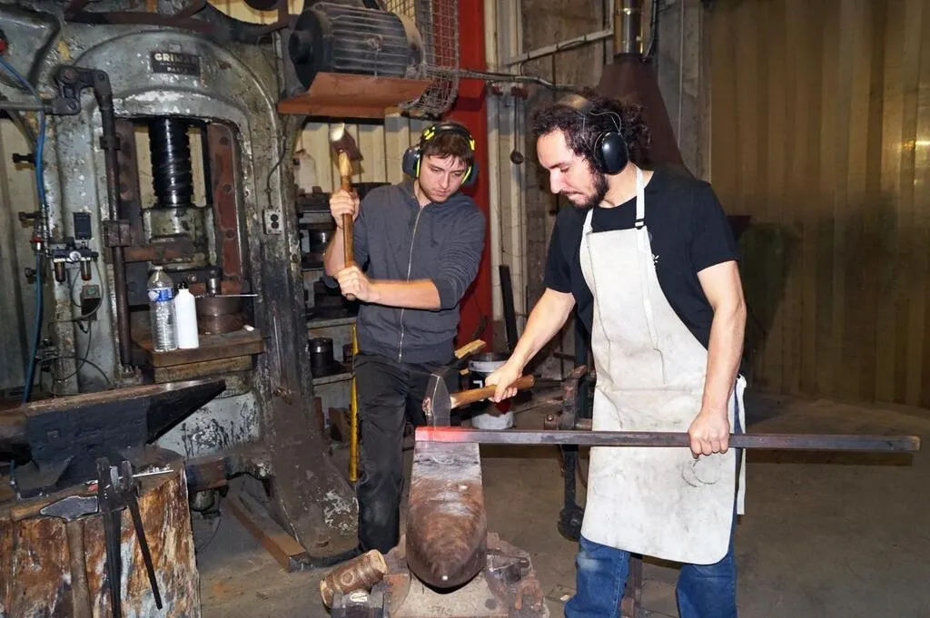 Valentin, à droite, a fait ses études à l’école Boulle. Il vient d’arriver dans l’entreprise et peaufine un châssis de luminaire sous l’œil de Théo, le chef d’atelier. © Ouest-France