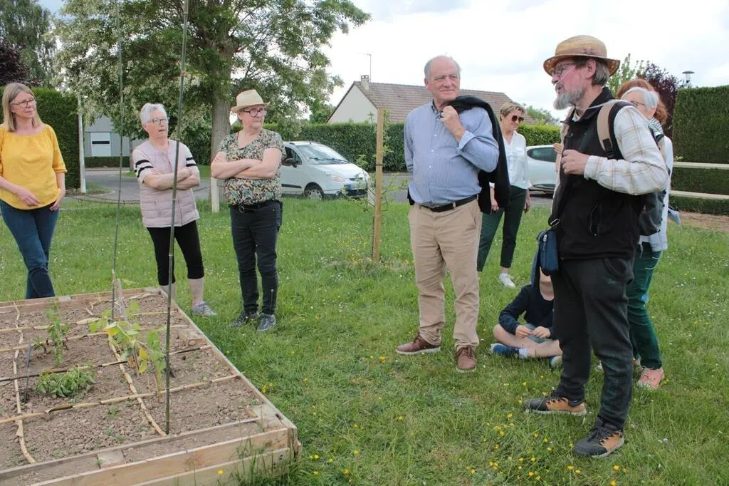 Quelques habitants ont participé à la visite des carrés potagers. Ici Denis Tsaousoglou, de l’association Montviette Nature, qui donne quelques astuces de jardinage. © Ouest-France