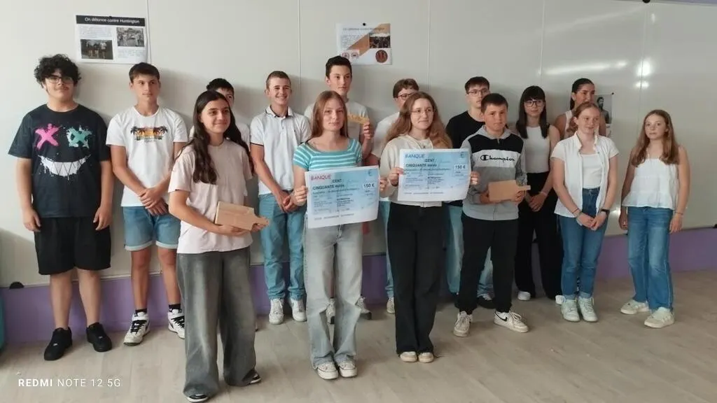 Les élèves de la Scop du collège Malraux, arborant les deux chèques qui vont être donnés à l’association On détonne pour Huntington. © Ouest-France