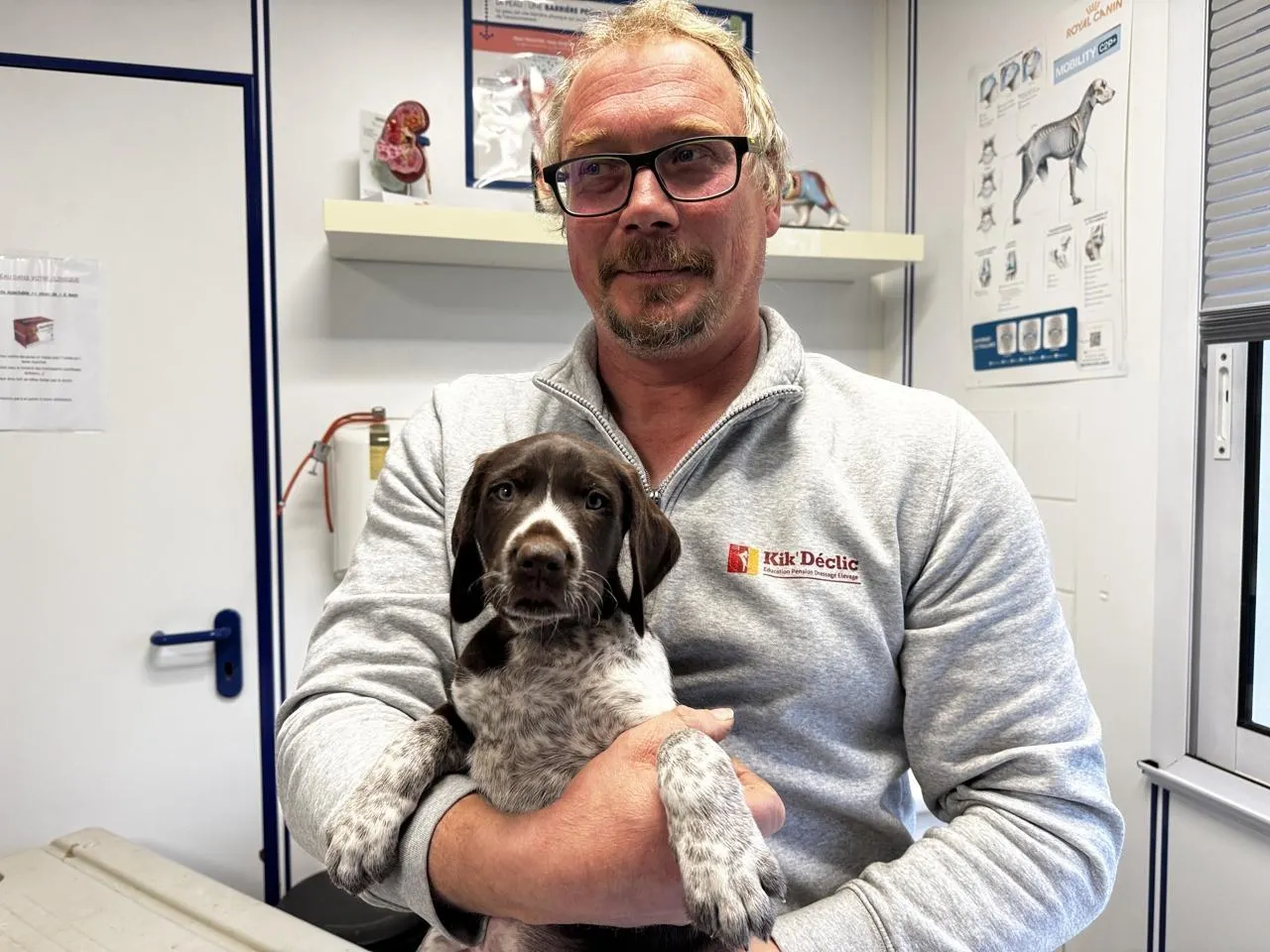 Guillaume Ganivet, responsable de la fourrière Kik’Déclic depuis treize ans, et Aphrodite, une des dix chiots qu’il a sauvés d’une mort certaine. © Ouest-France