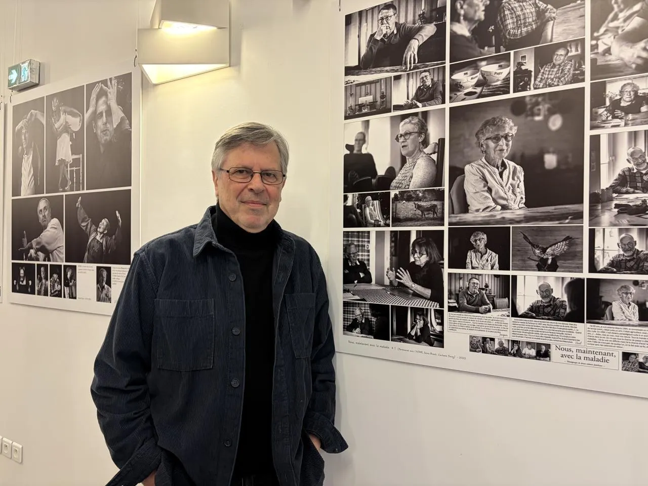 Gilles Juhel pose devant sa série préférée (à droite), celle mettant en valeur des aidants familiaux, en partenariat avec l’ADMR. © Ouest-France