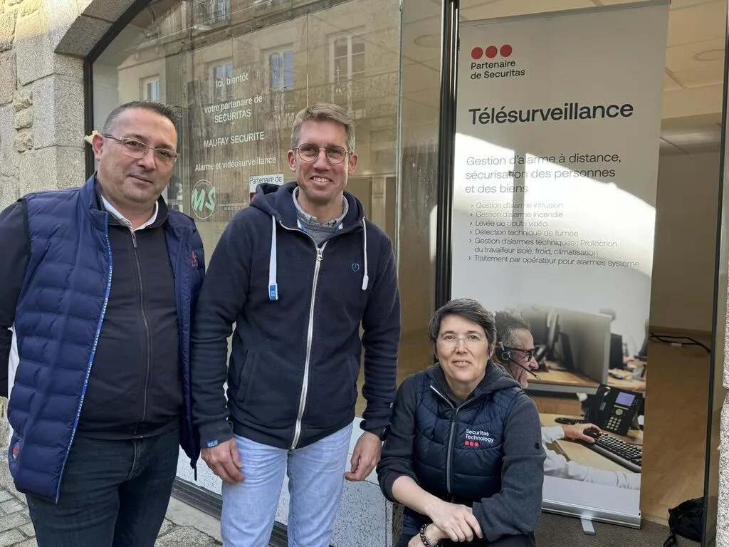 Sébastien Gévraise, commercial chez Visiotech, Romain Maufay, commerçant et Karine Hallier, membre de Securitas technology, devant la future agence Maufay sécriuté à Alençon (Orne). © Ouest-France