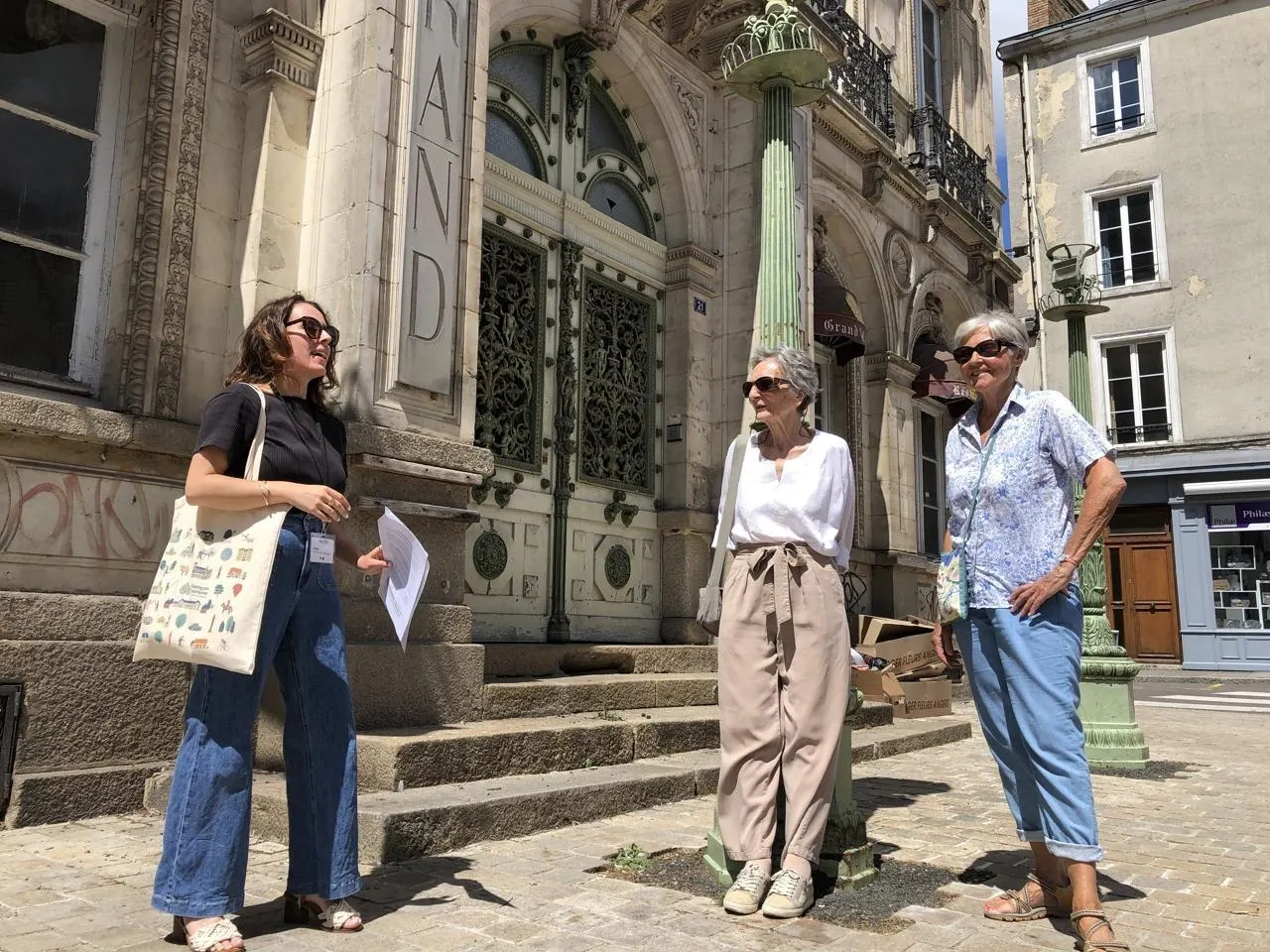 Lou Marais, guide touristique, avec deux participantes lors de la première visite « Alençon la discrète » organisée par l’office de tourisme, devant le Grand Cerf, un des bâtiments emblématiques de la ville. © Ouest-France