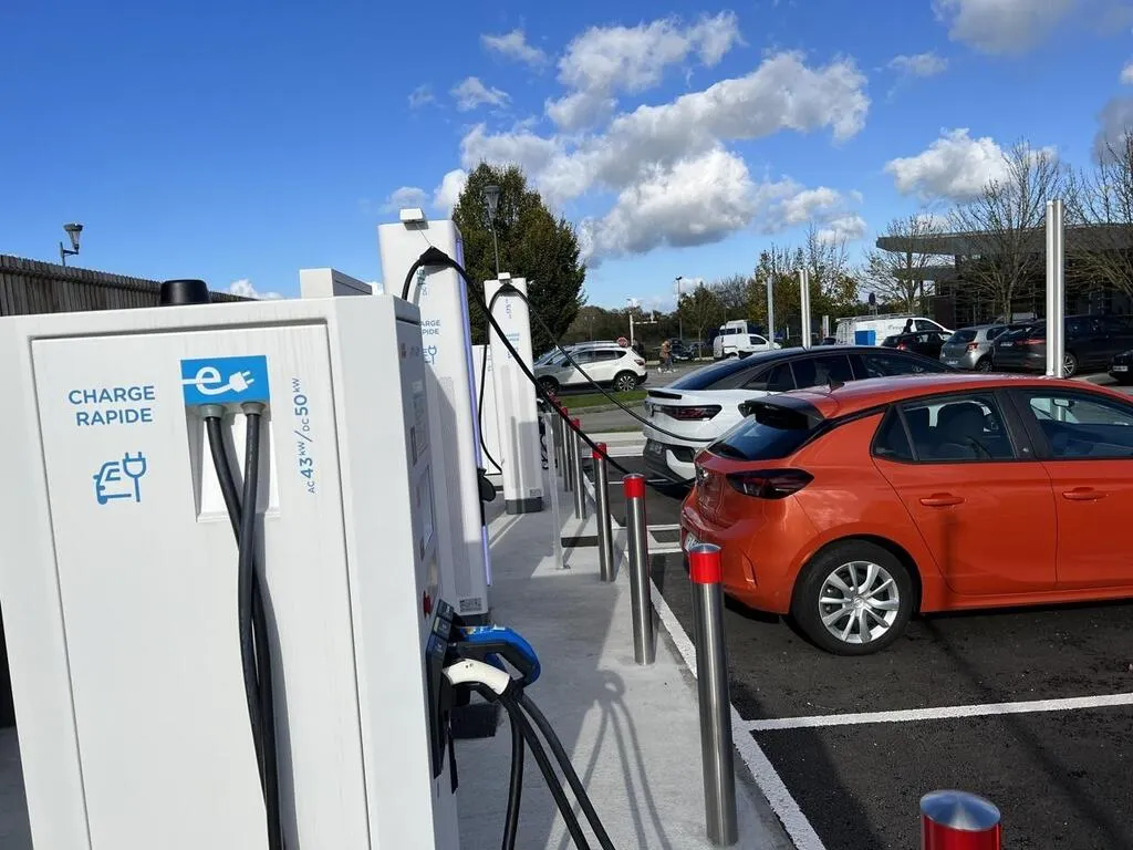 Au bord de l’autoroute A28, l’aire de la Dentelle à Alençon (Orne) bénéficie d’une station de superchargeurs. Les automobilistes rencontrés sont partagés entre un investissement rentable par rapport au thermique et un manque d’infrastructures.