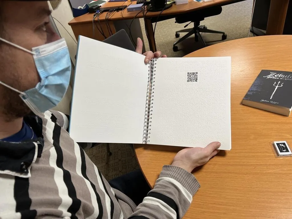 Dans sa version braille conçue avec des spécialistes d’un centre de transcription à Toulouse (Haute-Garonne), l’ouvrage se décline en trois volumes et contient un QR code pour accéder au podcast. « J’ai travaillé la partie audiovisuelle avec des comédiens pour que ce soit confortable à l’écoute. »