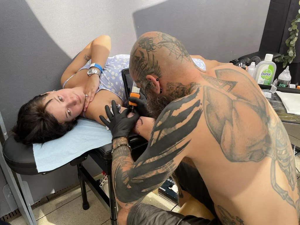 Grinch, tatoueur tatoué de 37 ans, dessine un papillon sur le bras de Lola, 21 ans. © Ouest-France