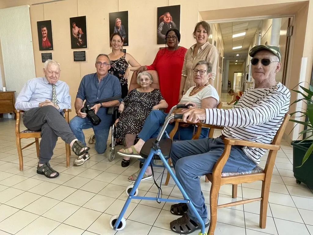 Au premier plan, des résidents et le photographe Xavier Rocton. Au deuxième plan, Élodie Pilon, animatrice, Virginie Haxaire, aide-soignante formée aux soins esthétiques, et Emmanuelle Emery, psychologue. © Ouest-France