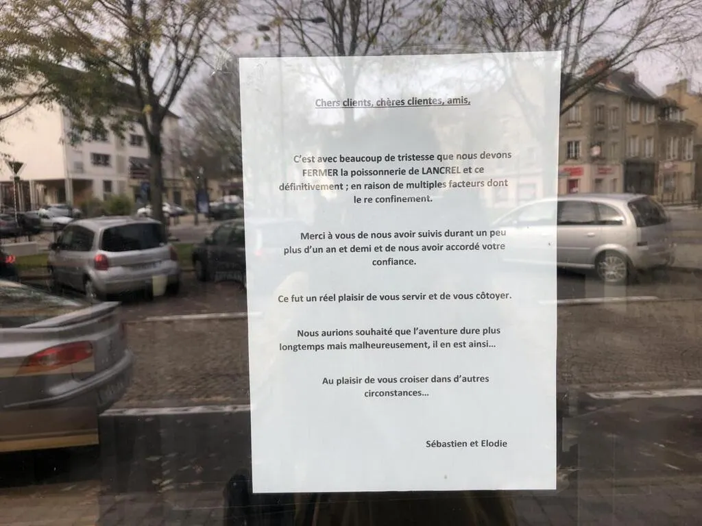 La poissonnerie de Lancrel, à Alençon (Orne), a annoncé sa fermeture définitive, sur sa vitrine et ses réseaux sociaux. Parmi les raisons évoquées : le second confinement, commencé le 30 octobre 2020.