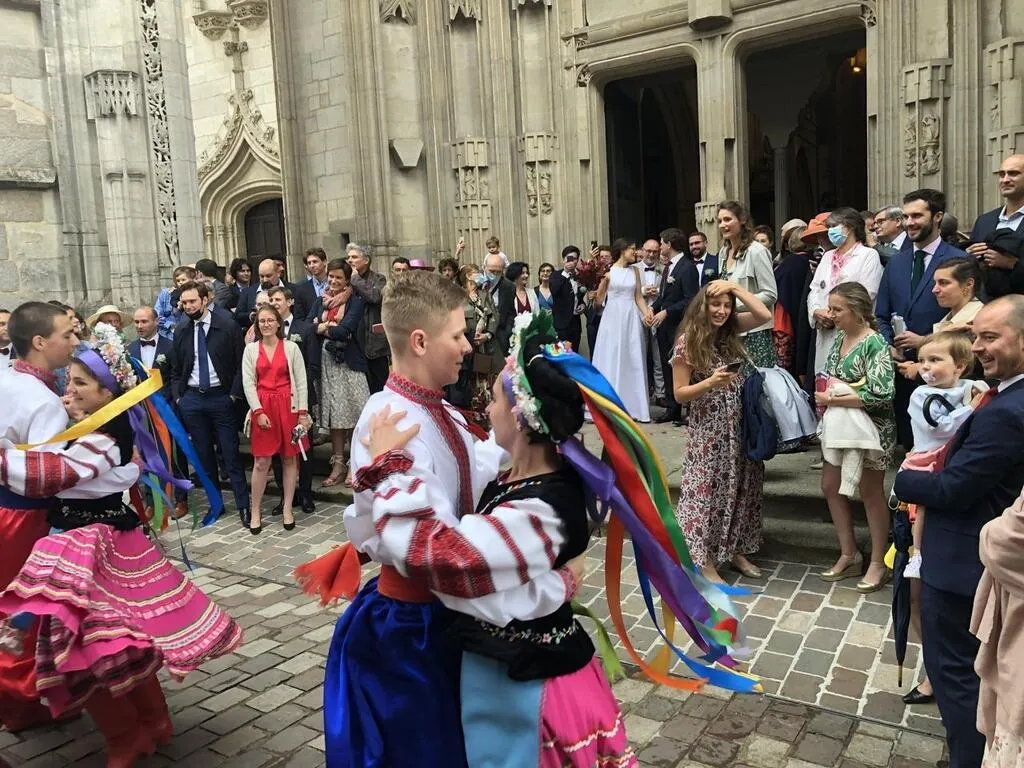 À la sortie de leur messe de mariage, Laëtitia et Gauthier ont eu droit à une représentation du groupe ukrainien. © Ouest-France