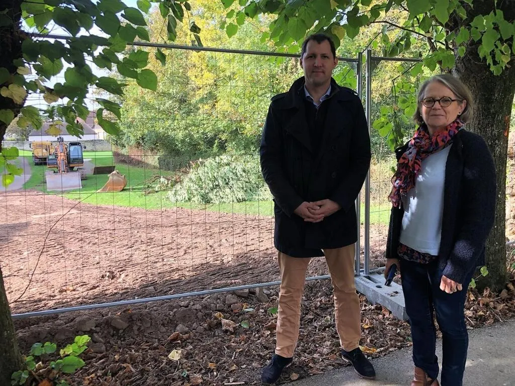 Baptiste Lenfant, président de l’organisme de gestion de l’enseignement catholique (Ogec) de l’établissement, et Annick Leroy, directrice du collège Notre-Dame-de-Lancrel, devant la rampe qui vient d’être aménagée pour les travaux. © Ouest-France