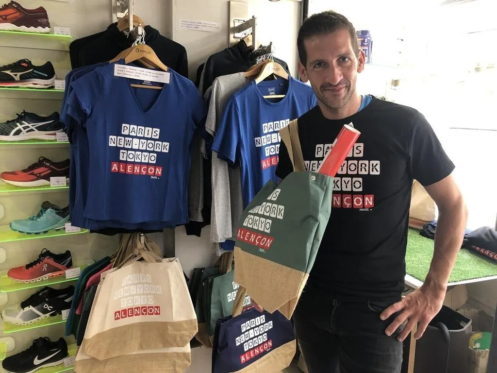 « Paris, New York, Tokyo, Alençon ». Le gérant de Running conseil a fait fabriquer des vêtements et des sacs qui portent ce slogan. Et la clientèle est au rendez-vous.
