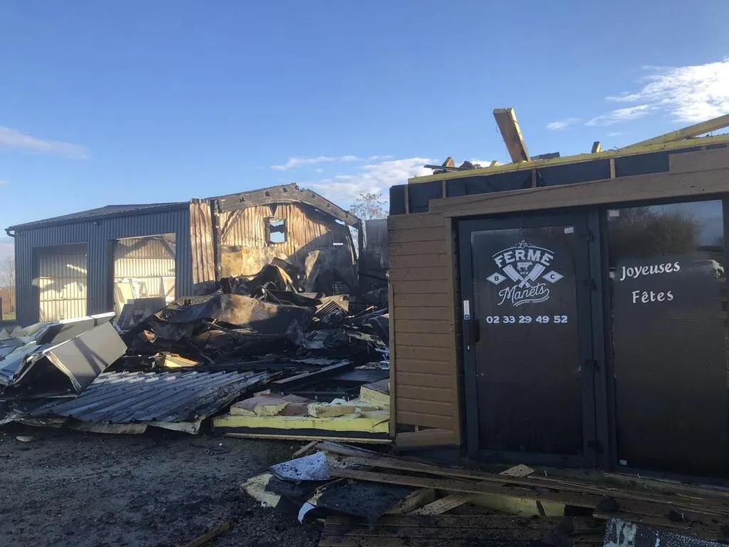 Le magasin de La Ferme des Manets a été entièrement détruit par un incendie dans la nuit du mercredi 29 au jeudi 30 novembre 2023. © Ouest-France