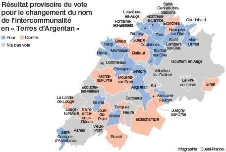 Les conseils municipaux des quarante-neuf communes composant Argentan Intercom ont jusqu’au 24 avril 2023 pour délibérer sur le changement de dénomination (Terres d’Argentan). Vingt communes ont voté pour, quatorze ont voté contre, et quinze vont bientôt se prononcer.
