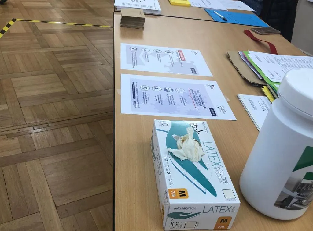 Gants en latex, lingettes désifectantes, gel hydroalcoolique voire masques : on ne lésinait pas sur les précautions sanitaires, dans les bureaux de vote, hier. © Ouest-France