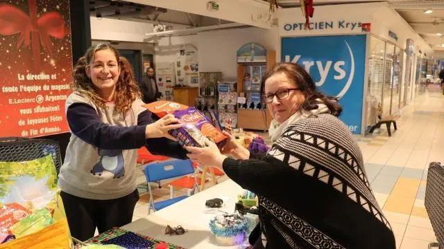 Cette cliente offre un sac de croquettes à Wendy, l’une des coprésidentes des Paniers du cÅ“ur. © Ouest-France
