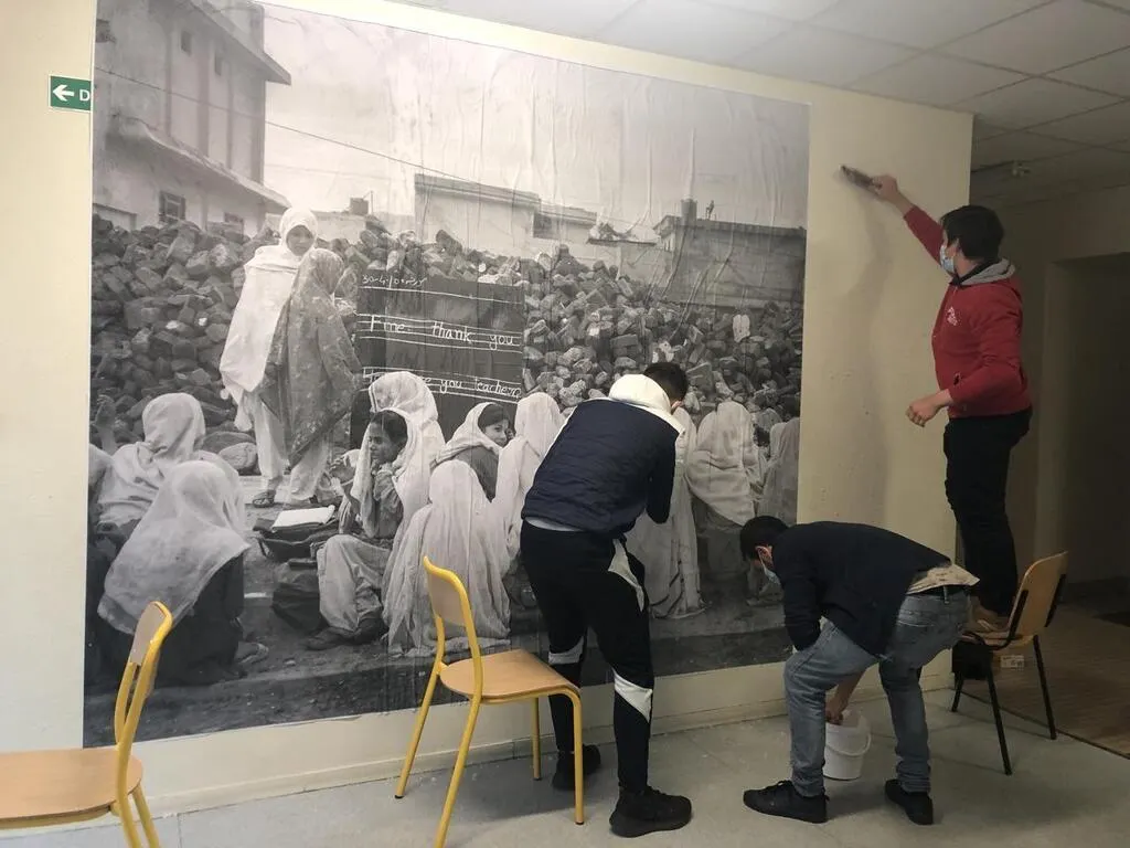 Une odeur de colle imprègne le hall d’entrée des ateliers du lycée Gabriel, à Argentan (Orne), jeudi 25 novembre 2021. Une classe de BTS s’affaire à imbiber les lés d’une photographie, en noir et blanc, pour la coller au mur. Elle représente une classe de jeunes filles devant l’école de Mingora (Pakistan), détruite par les talibans. Mingora était la ville de Malala Yousafzai, Pakistanaise, prix Nobel de la paix pour son combat pour le droit à l’éducation. La photo, elle, est l’œuvre de Sara Farid, photojournaliste pakistanaise exilée en France.