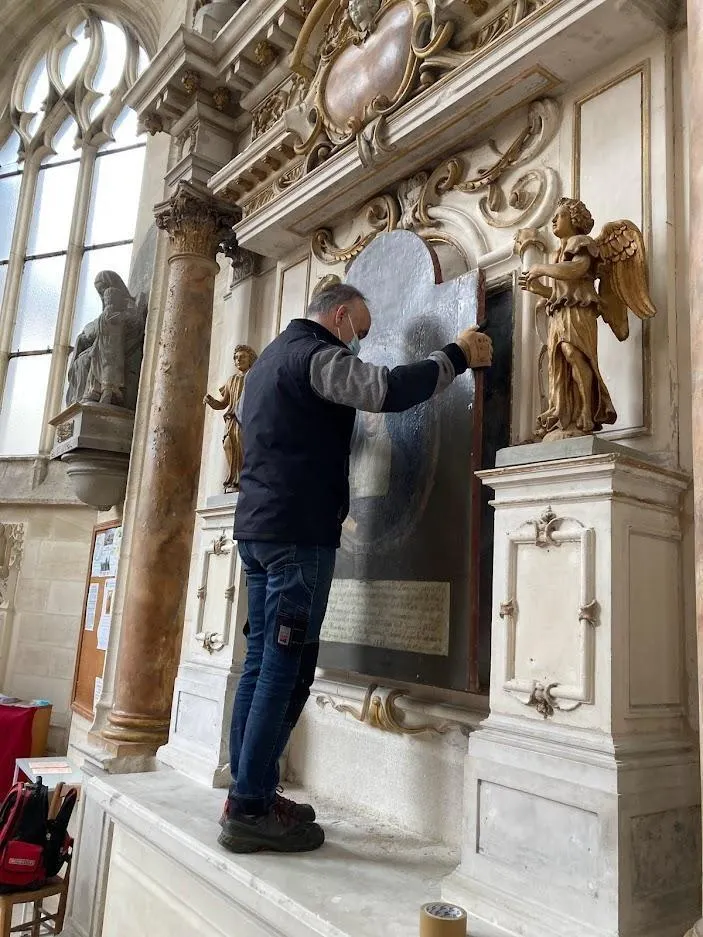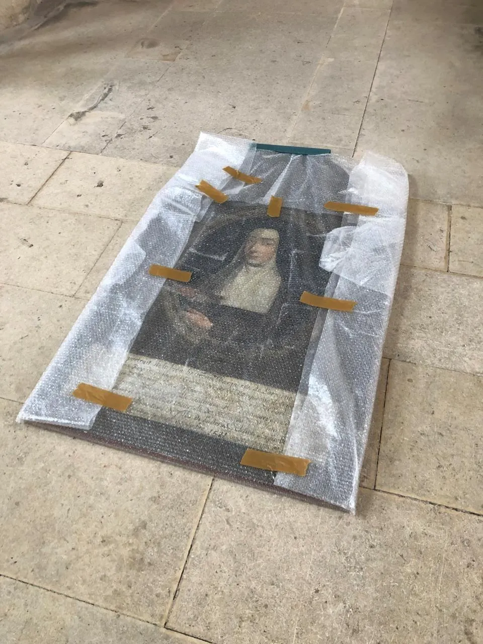 La dépose du tableau représentant Marguerite de Lorraine a été effectuée, mercredi 23 février 2022, dans la chapelle Saint-Anne de l’église Saint-Germain, à Argentan. © DR