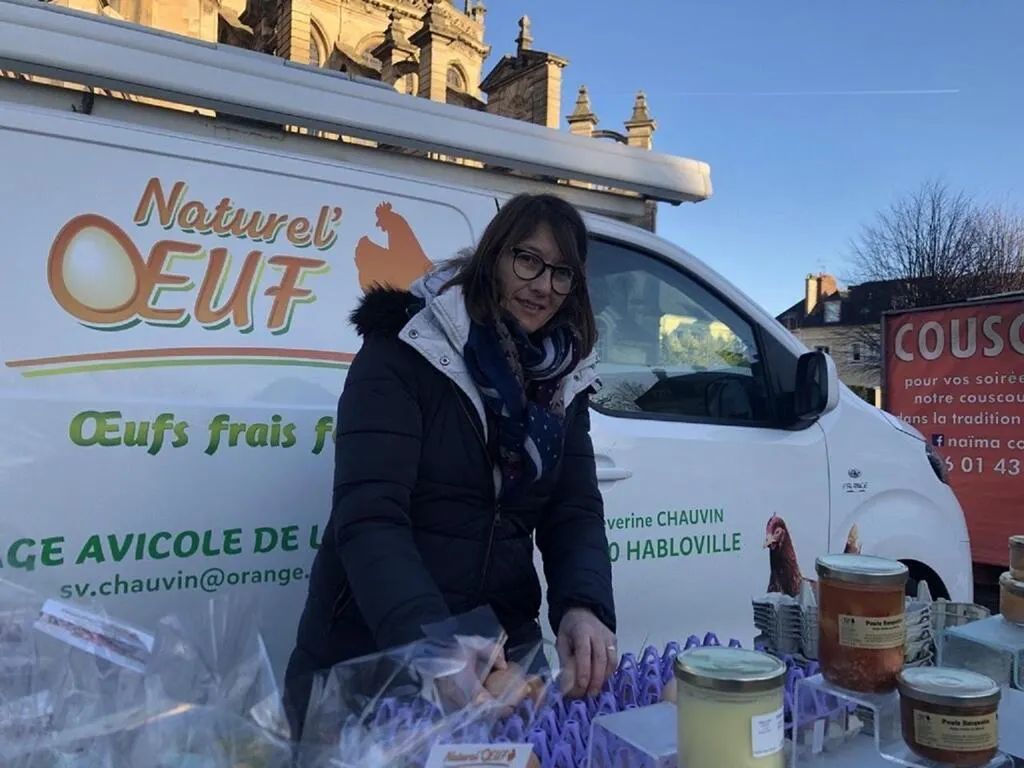 En 2014, Séverine Chauvin, productrice de poules pondeuses à Habloville (Orne), et présente le mardi sur le marché d’Argentan (Orne), a fait le grand saut.