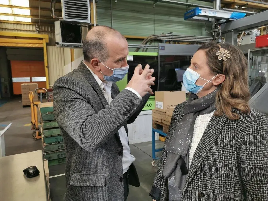 Franck Machurat, président-directeur général d'Ercé plasturgie, et Christine Royer, sous-préfète d'Argentan, à Athis-de-l'Orne (Orne), le 25 mars 2021. © Ouest-France