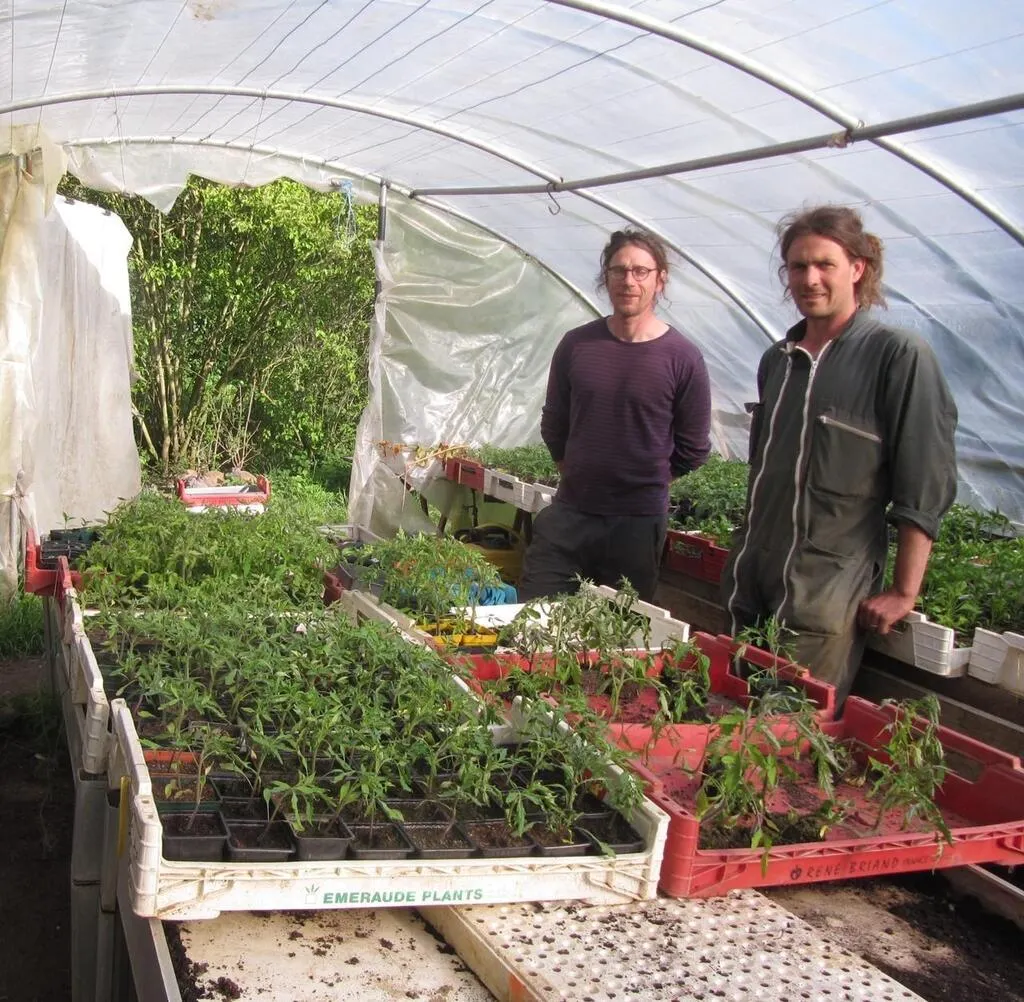 Yoan Noël (à gauche) et Émilien Houssaye : « Au-delà de la production de légumes, dans ce collectif, notre mission est de proposer au départ des produits de base (carottes, poireaux, choux rouges et verts oignons, navets, radis noirs, tomates cerises, poivrons), pour participer à l’éducation à l’alimentation en produits frais bio et de production locale en collectivité » © Ouest-France