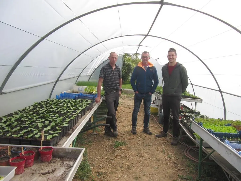 De gauche à droite : Sébastien Villette, Gilles Delaunay et Samuel Laforge dans le tunnel à semis. Pour Sébastien, « ette année, c’est compliqué. Les conditions climatiques ne sont pas favorables à un démarrage ; je suis seul et cultive sur un hectare pour la production de légumes, dont 10/20 % sous serre, le reste en plein champ ». Ouest-France
