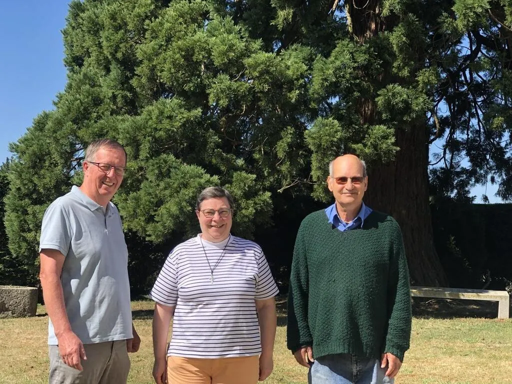 photo  jérôme, sÅ“ur hélène et frère emmanuel devant le séquoia de plus de 160 ans dans le jardin du diocèse de séez.  ©  ouest-france 1