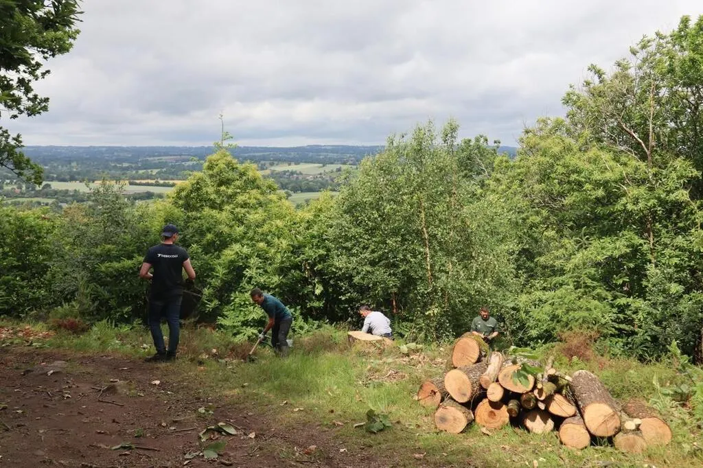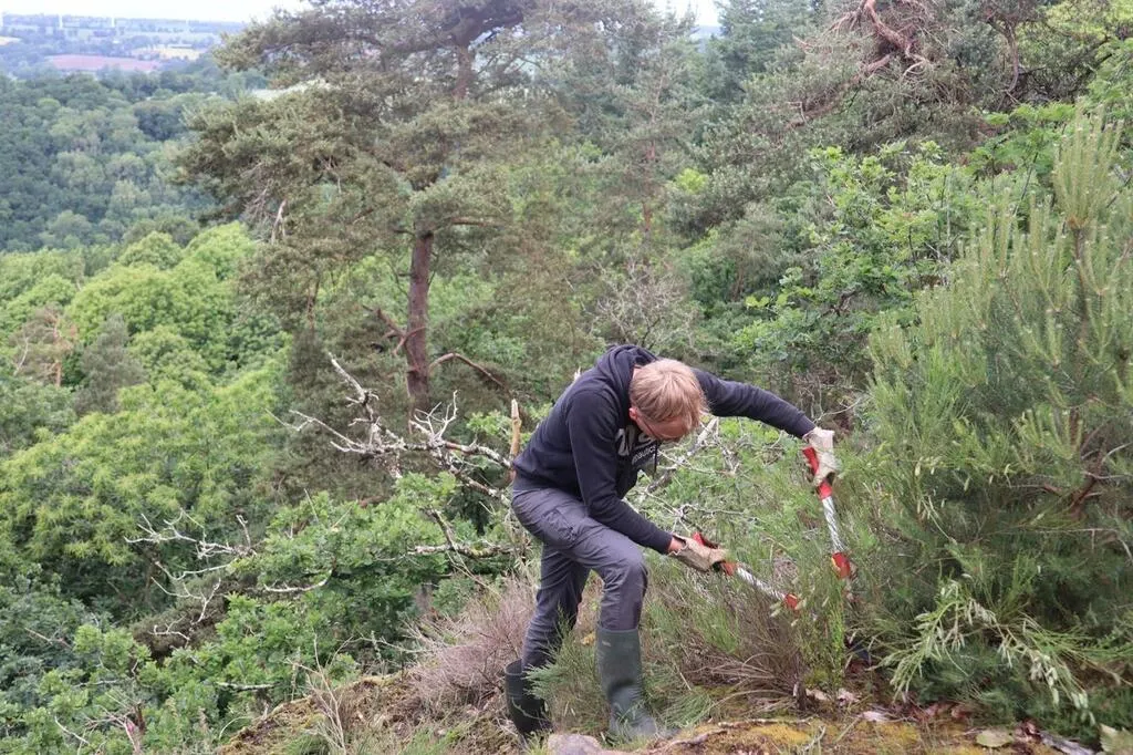 Vendredi 6 juin 2025, des salariés de l’entreprise Thermocoax, des membres de l’Association faune et flore de l’Orne, Flers agglo et l’Office national des forêts ont participé à une opération de restauration d’une lande sèche du mont de Cerisy. © Ouest-France