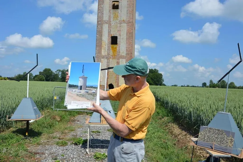 Patrick Marie a proposé pendant une dizaine d’années des ateliers conférences au pied du seul vestige d’un télégraphe Chappe en Normandie, la tour du Buat à Saint-Michel-Thubeuf (Orne). © Archives Ouest-France