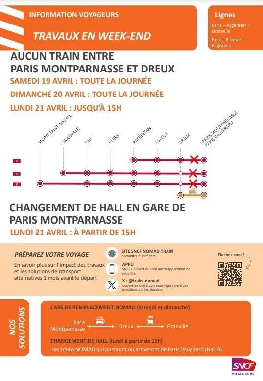 « Des cars de remplacement Nomad seront mis en place entre Paris Vaugirard (accessible depuis le milieu du quai 24) et Dreux dans les deux sens de samedi à lundi, 15 h », annonce la SNCF. Le reste du voyage se fera en train comme à l’accoutumée. De plus, « lundi 21 avril, à partir de 15 h, les trains Nomad partiront ou arriveront du hall 3 de la gare Paris Vaugirard ».