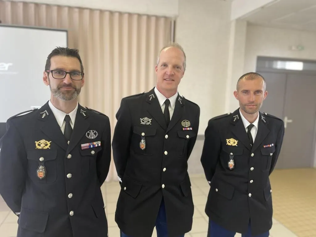 Le major David Deleuze, le commandant Romain Soulary et le lieutenant Gaylord Buré, lors de l’inspection de la communauté de brigades de gendarmerie de La Ferté-Macé, vendredi 5 avril 2024, à Saint-Hilaire-de-Briouze. © Ouest-France