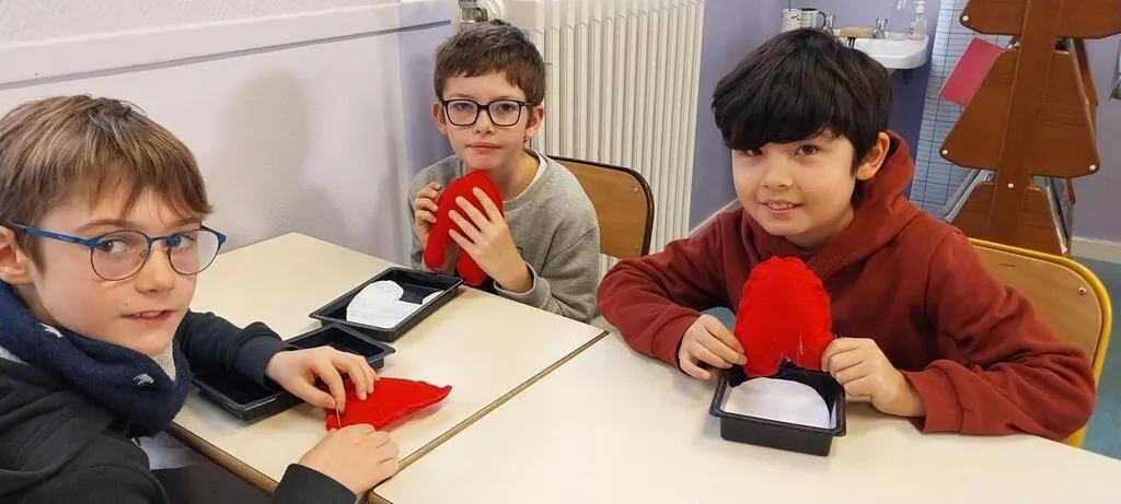 Noam, Louis et Kim de l’école Sévigné-Paul Bert préparent leur propre mascotte « phryge ». Ils les utiliseront pour le concours photos d’Orn’Olympik. © Ouest-France