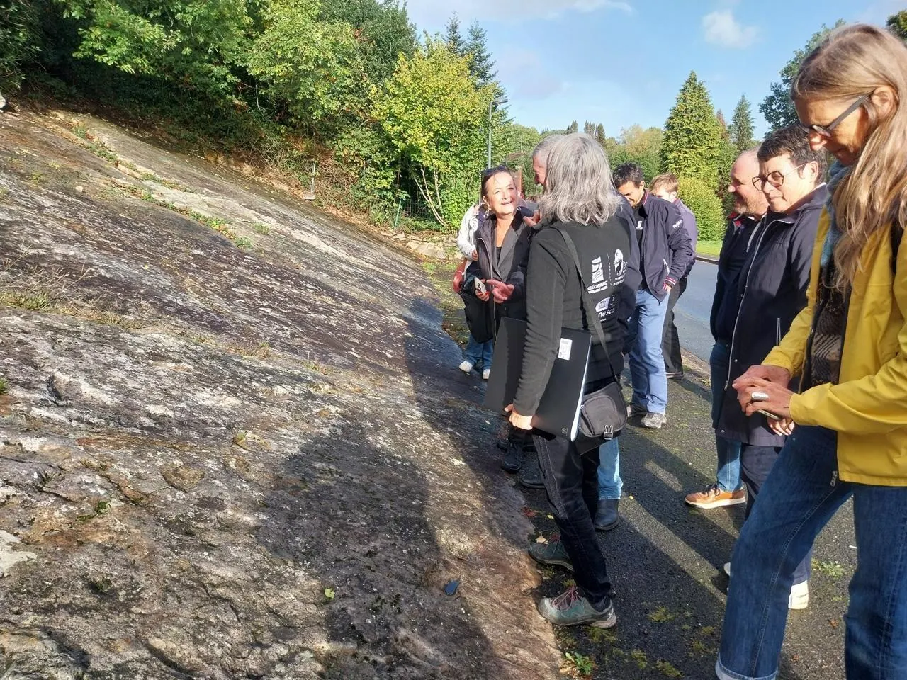 Avec le retrait de la mer, l’eau creusa une trouée où la rivière Vée coule encore aujourd’hui. Julien Lesclavec, du pôle patrimoine, et Caroline Crémadès chargée des projets biodiversité de la Région, ont aussi apporté leurs explications et présenté les autres sites géologiques remarquables de la Normandie. Les élus et participants se sont ensuite rendus  à la dalle de l’allée Béatrix, pour l’inaugurer ».