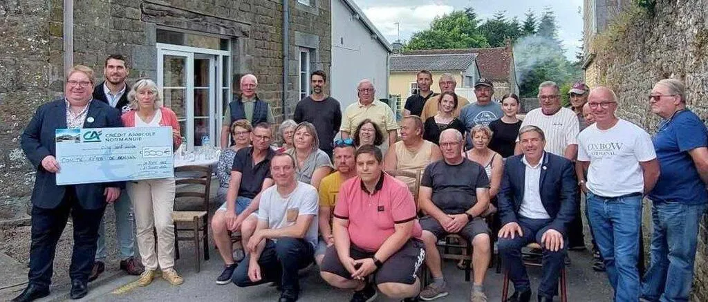 Lors de la remise de chèque du fonds initiative du Crédit agricole. À partir de la gauche : Jean-Yves Moulin, directeur de la caisse centrale des Andaines ; Frédéric Gauché, directeur de la caisse locale de La Ferté-Macé ; Catherine Rebel, administratrice ; Nicolas Andron, président du comité des fêtes et de nombreux adhérents. © Ouest-France