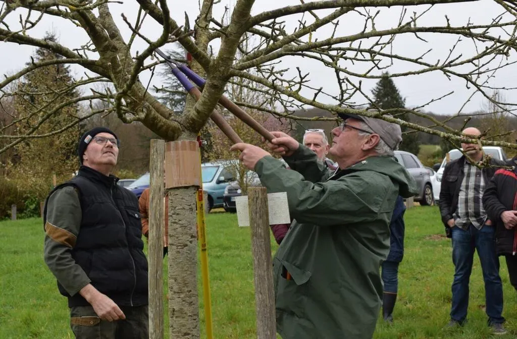 Un sécateur bien affûté en main, il a expliqué quelles branches couper, utilisant aussi un coupe-branche ou un échenilloir télescopique pour les branches hautes. À ses côtés, Yves et Daniel Chevée, maire de la commune répondaient aussi aux questions des participants repartis vers leurs arbres pour les éclaircir, particulièrement en son centre en gardant en tête le principe ancestral  qu’un oiseau en plein vol puisse traverser le branchage sans toucher les branchesÂ