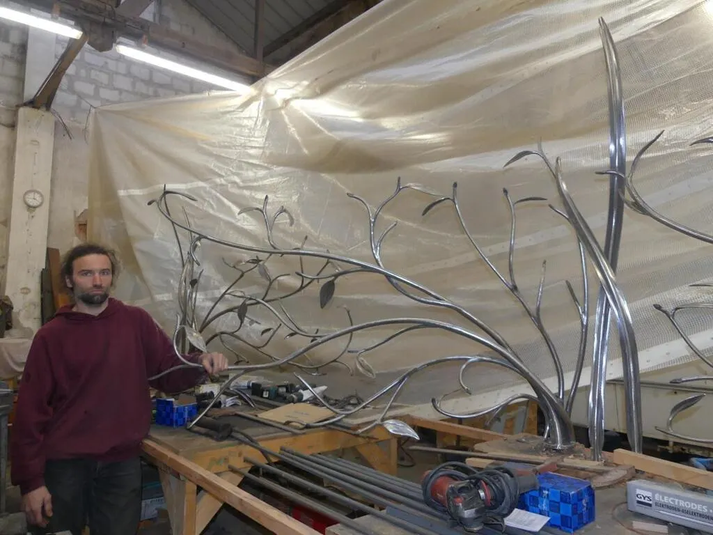 Maël Lefrançois dans son atelier, devant son portail inspiré par la nature. © Ouest-France
