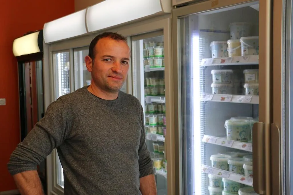 Avec le retour des beaux jours, la turbine à glace tourne à plein régime. Les crèmes glacées et les sorbets qui en sortent régaleront bientôt les gourmands. La scène ne se passe pas dans l’arrière-boutique d’un glacier, mais dans le laboratoire attenant à l’épicerie Au pré de ma ferme, en plein cœur du bourg de Briouze, dans l’Orne.