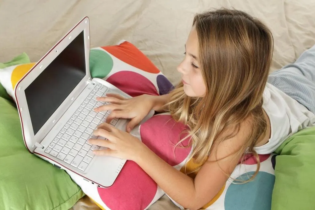 Une fillette de 11 ans utilise un ordinateur portable allongée sur le lit de sa chambre. (Photo d’illustration) © archives Philippe Devanne