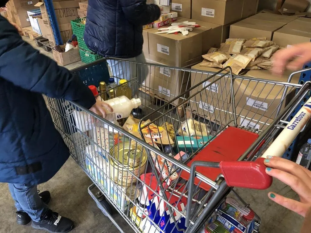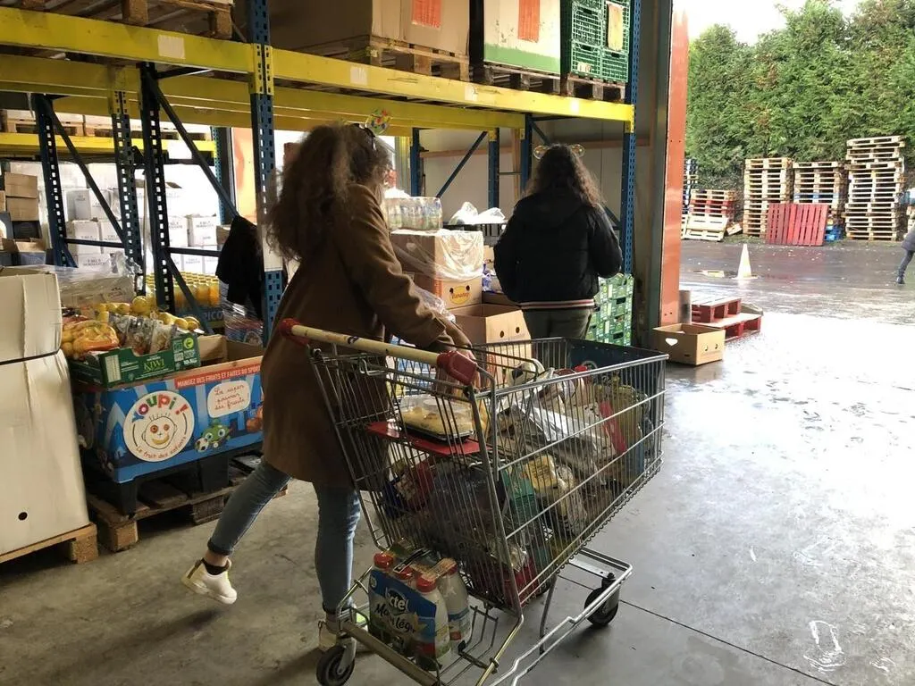 De jeunes bénévoles du Secours populaire d’Argentan remplissent un chariot de Noël. © Ouest-France