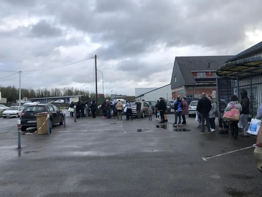 La queue est longue à l’entrée du Secours populaire d’Argentan (Orne) mercredi 23 décembre 2020. En cette veille de Noël, 243 personnes sont venues chercher leur colis de Noël. Au menu du jour, fruits, légumes, masques, céréales, lait ou encore cassoulet, mais aussi des produits de fête, souligne la secrétaire générale de la fédération ornaise, Marie Viel.