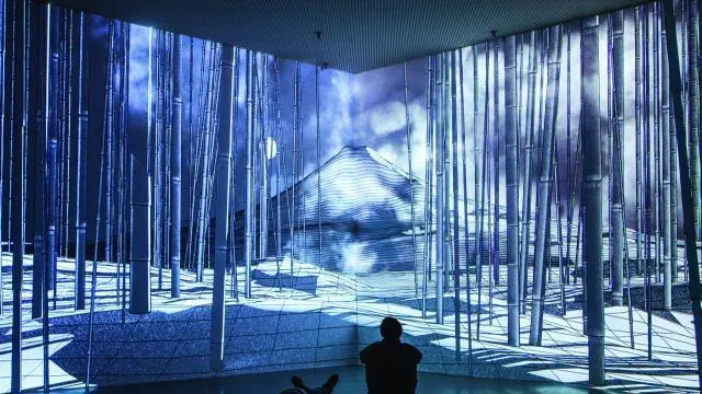 Et quatre premières françaises, parmi lesquelles un bras de robot écrivant en allemand la bible de Luther (Robotlab) et un mapping (projection) donnant l’illusion que le mont Fuji se dirige vers la lune (Joanie Lemercier).