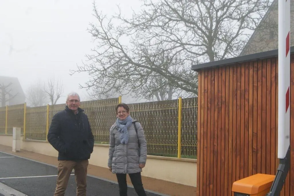 Le maire, Gilles Rabache, avec son adjointe à la vie scolaire devant le nouveau local à poubelles et la barrière qui sécurise la rue de l’école. © Ouest-France