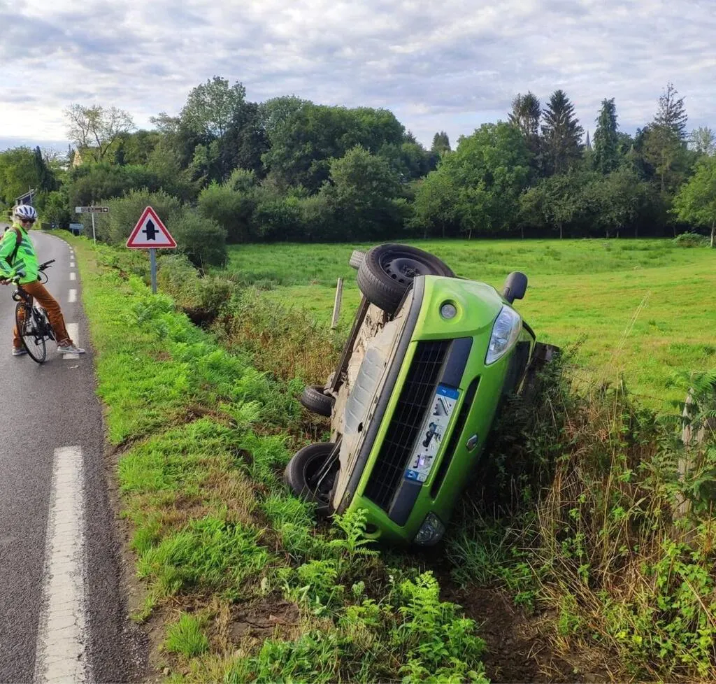 Fort heureusement, l’homme a juste quelques égratignures. Il a pu sortir du véhicule avec l’aide d’une dame, propriétaire du champ attenant, qui lui a tenu la porte et de la cycliste qu’il a voulu dépasser. « J’allais sortir mes poules et là j’ai entendu un gros bruit sourd… Je suis donc venue voir ce qu’il se passait », lance la propriétaire du champ. La police et les pompiers sont arrivés sur place vers 09 h 30. Les pompiers ont examiné le conducteur du véhicule, qui n’avait que quelques égratignures.
