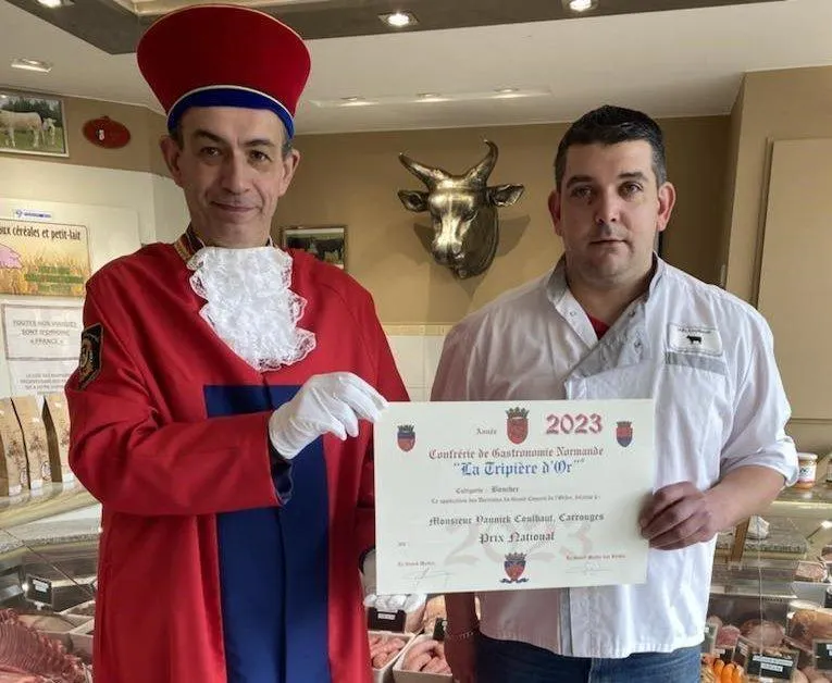 Yannick Coulbault, boucher charcutier, a reçu hier le titre d’honneur de la Tripière d’Or dans la catégorie boucher. La Tripière d’Or est une confrérie qui assure depuis soixante-dix ans la promotion de la recette des tripes à la mode de Caen.